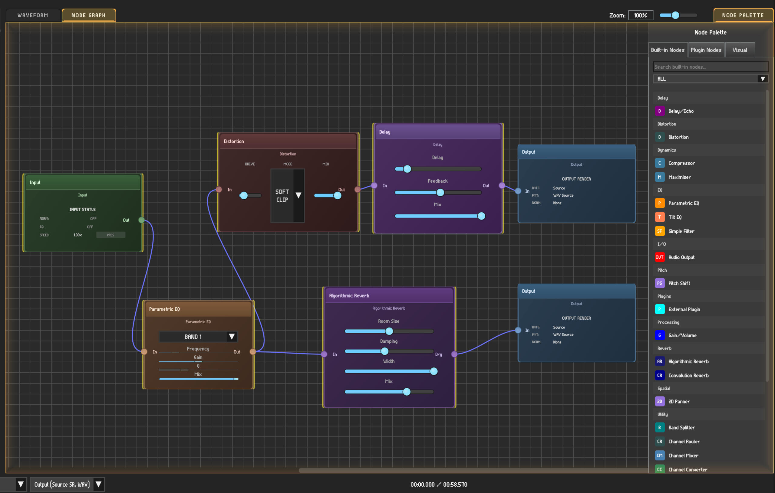 Every effect in Batchy has its own quirky personality. Chain them together in the node graph to see what sonic magic they cook up. Want to normalize, EQ, compress, verberize, pitch and export in a single pass? No problem—they all get along (mostly).